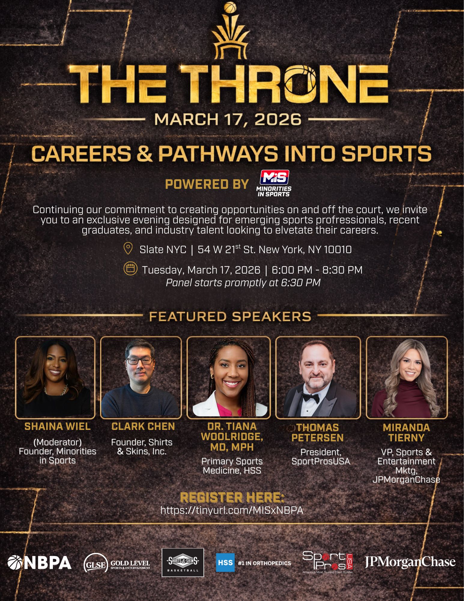 Meet us in NYC on March 17th for our Pathways into Sports panel and happy hour in partnership with the National Basketball Players Association. There will be networking, cocktails, conversations, and vibes as we kick off The Throne week. More info to come!